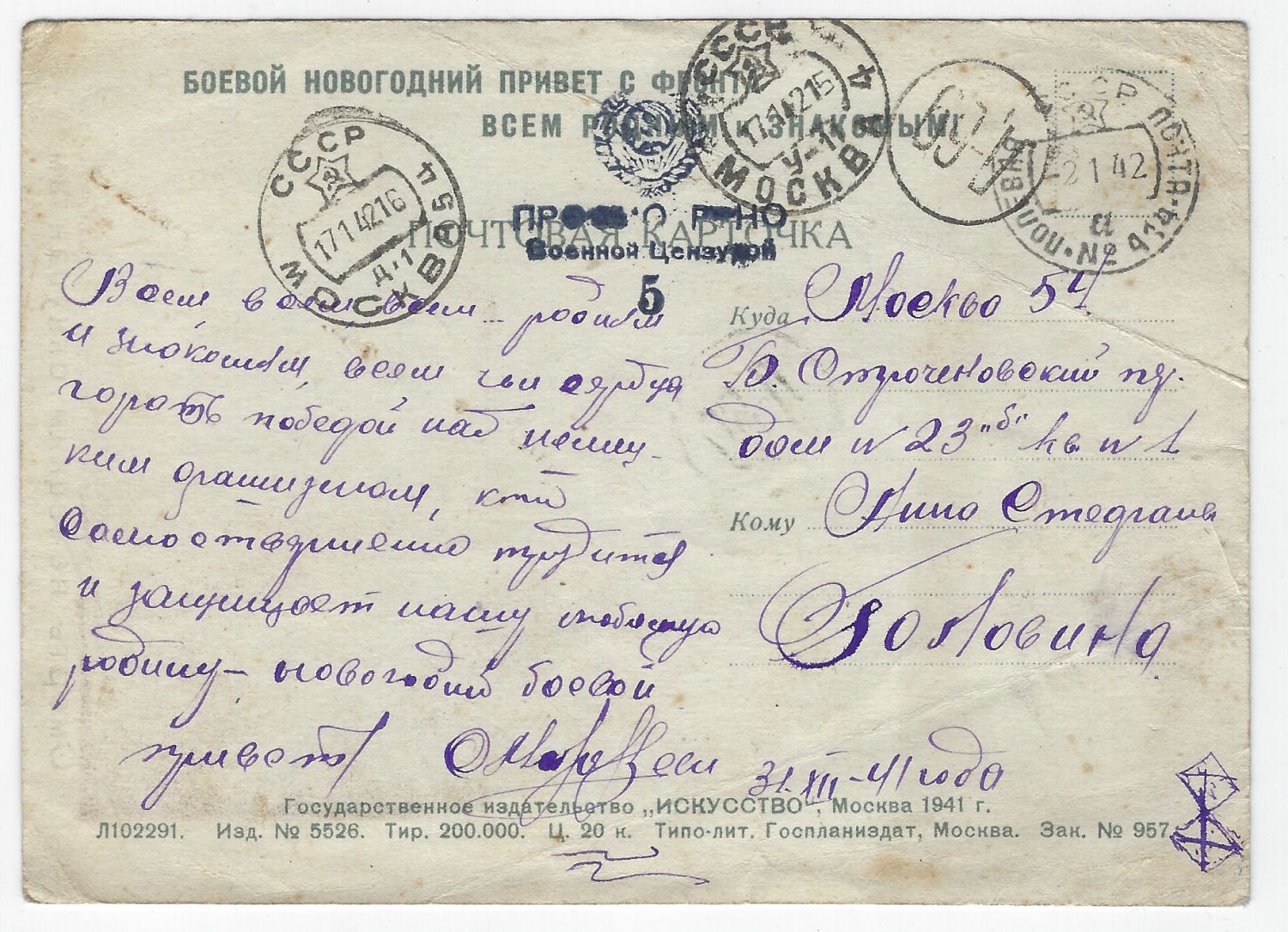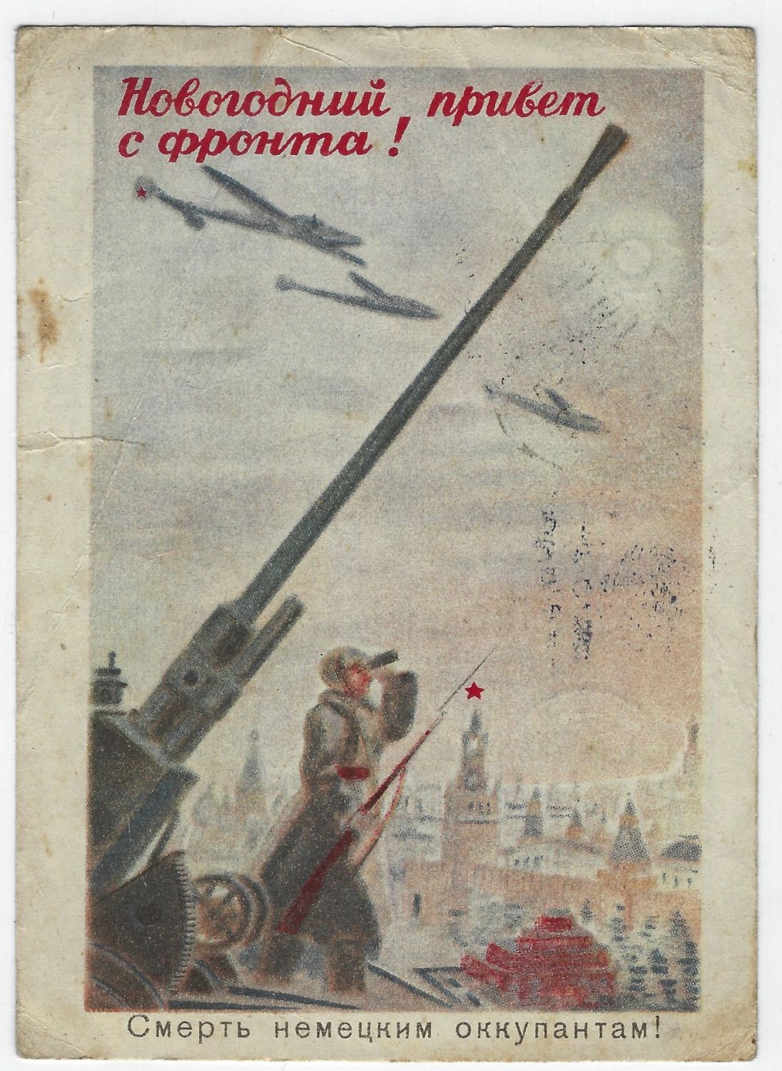 Новогодний привет с фронта! Смерть немецким оккупантам! Боевой Новогодний привет с фронта всем родным и знакомым! Почтовая карточка прошла почту, штемпель полевой почты, военная цензура. 1941 г. Хорошая сохранность. Размер - 14,8х10,6 см.