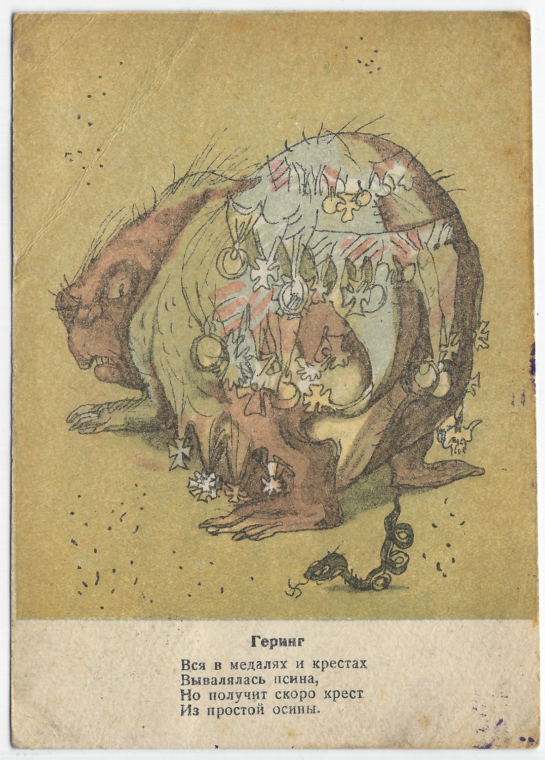 Блокада. Карикатура. Геринг. Почтовая карточка из серии "Цепные фашистские собаки". Худ. В. Гальба. Ленинград. 1943 г. Прошла почту, штемпель военной цензуры. Незначительные дефекты, сохранность хорошая. Размер - 14,7х10,4 см.