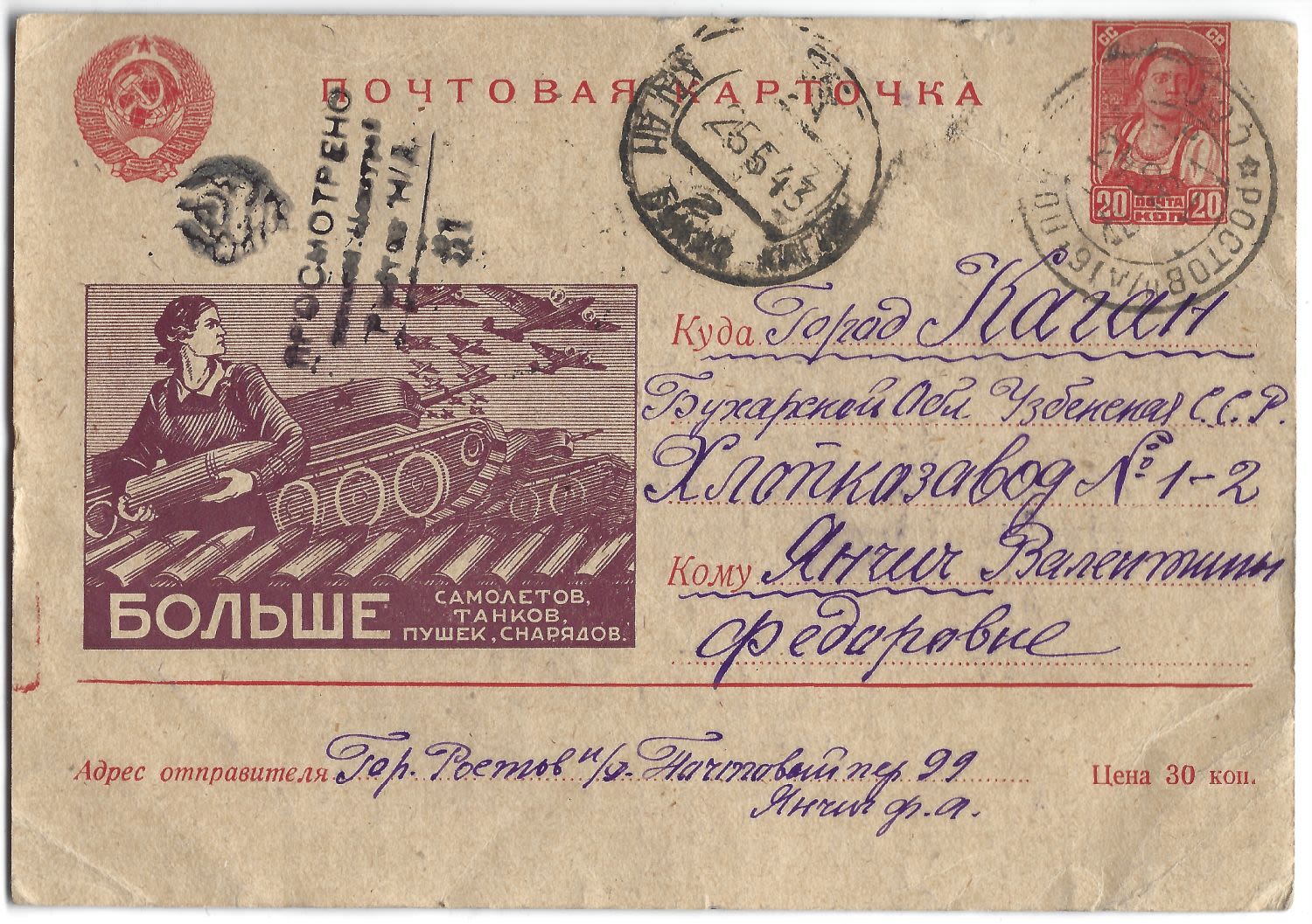 Больше самолетов, танков, пушек, снарядов. Агитационная почтовая карточка. Просмотрено военной цензурой. 1943 г. Отличная сохранность. Размер - 14,4х10,1 см.