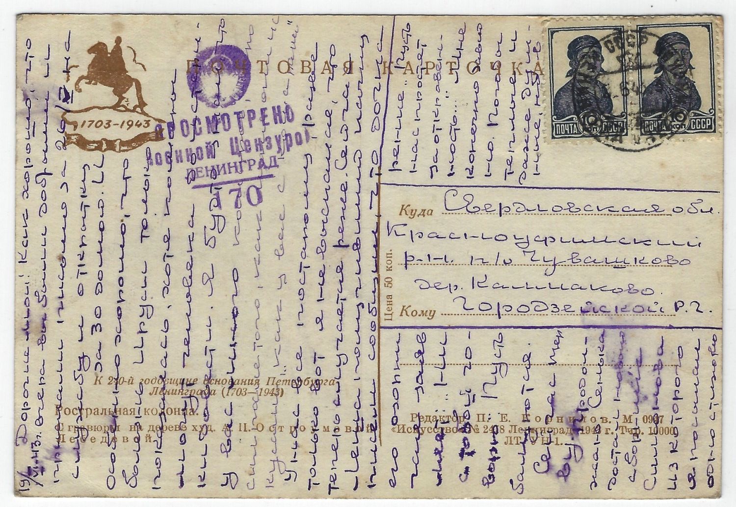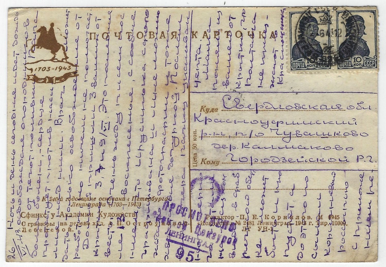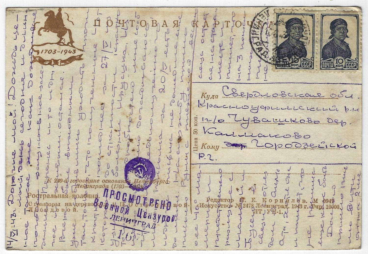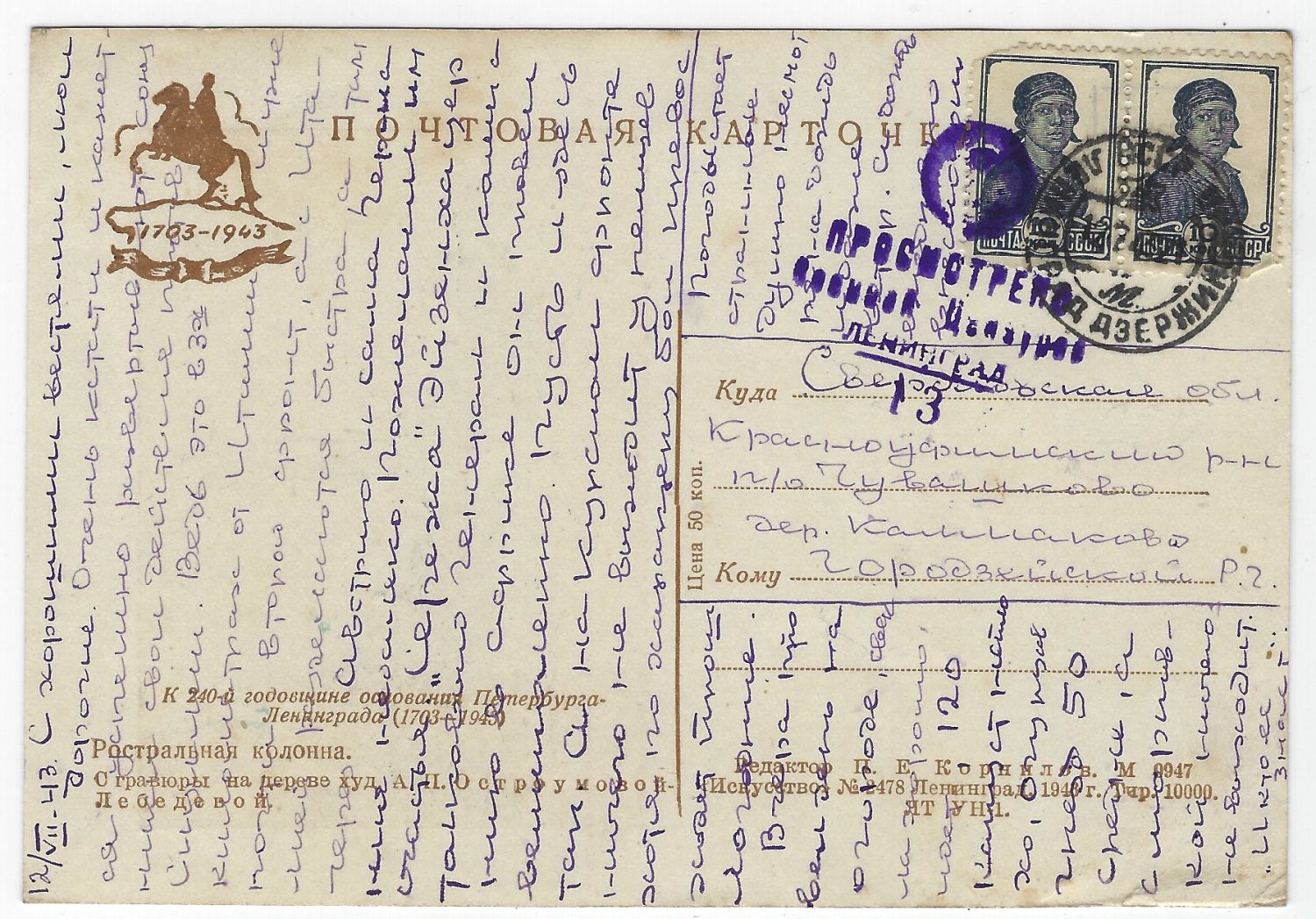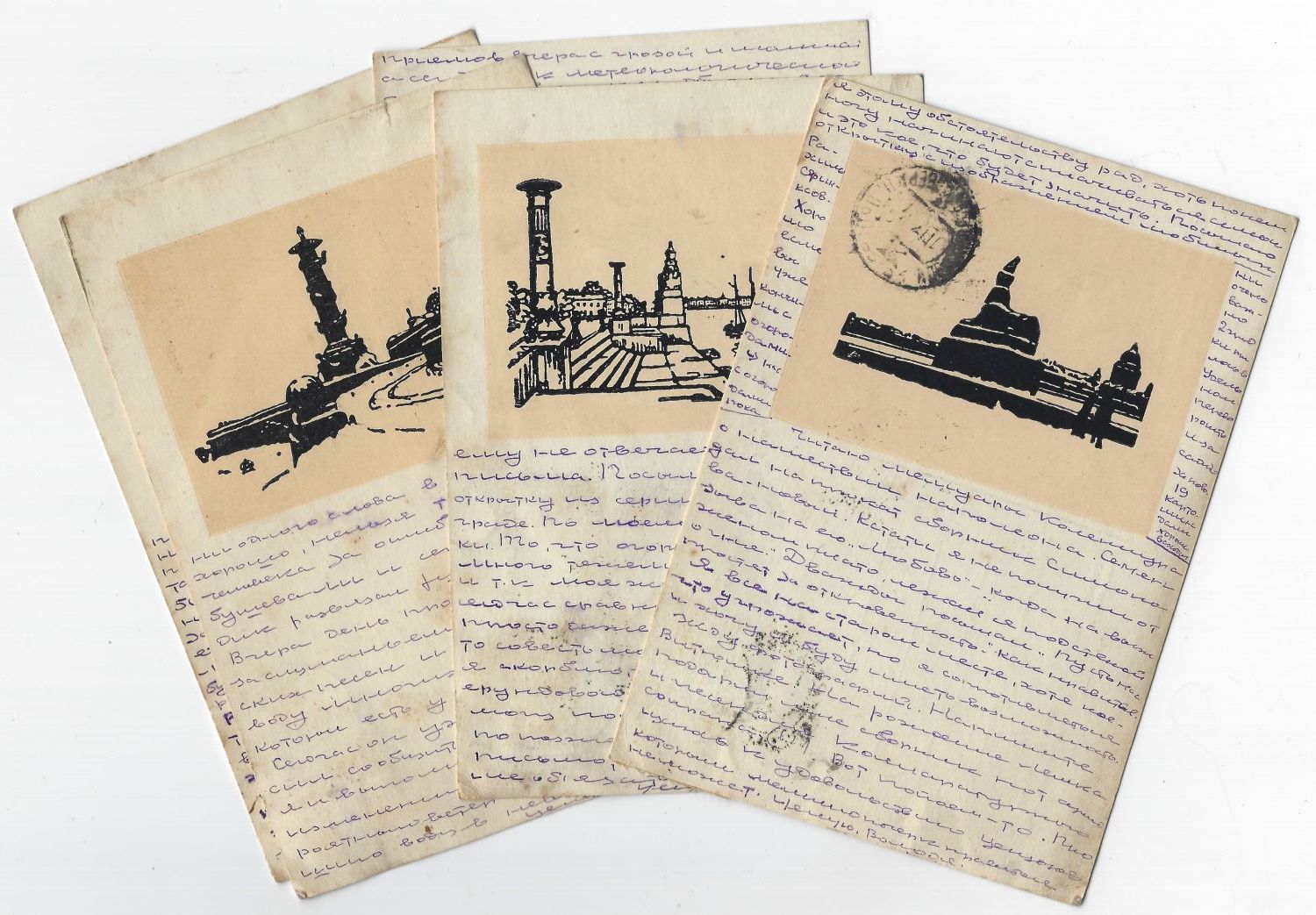 Блокада. Лот пять почтовых карточек из осажденного города. Худ. А. Остроумова-Лебедева. Из серии «К 240-й годовщине основания Петербурга–Ленинграда (1703–1943)». Прошли почту, просмотрено военной цензурой. 1943 г. Хорошая сохранность. Размер - 14,6х10,1 с