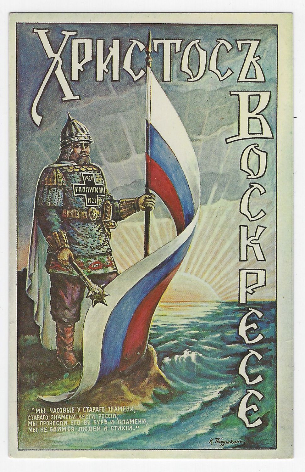 "Мы часовые у старого знамени, старого знамени чести Росси, мы пронесли его в буре и пламени, мы не боимся людей и стихии." Христос Воскресе ! Худ. К. Подушкин. 1950-е гг. Открытка изд. Отдела Об-ва Галлиполийцев в США. В пользу дома пристарелых. Отличная