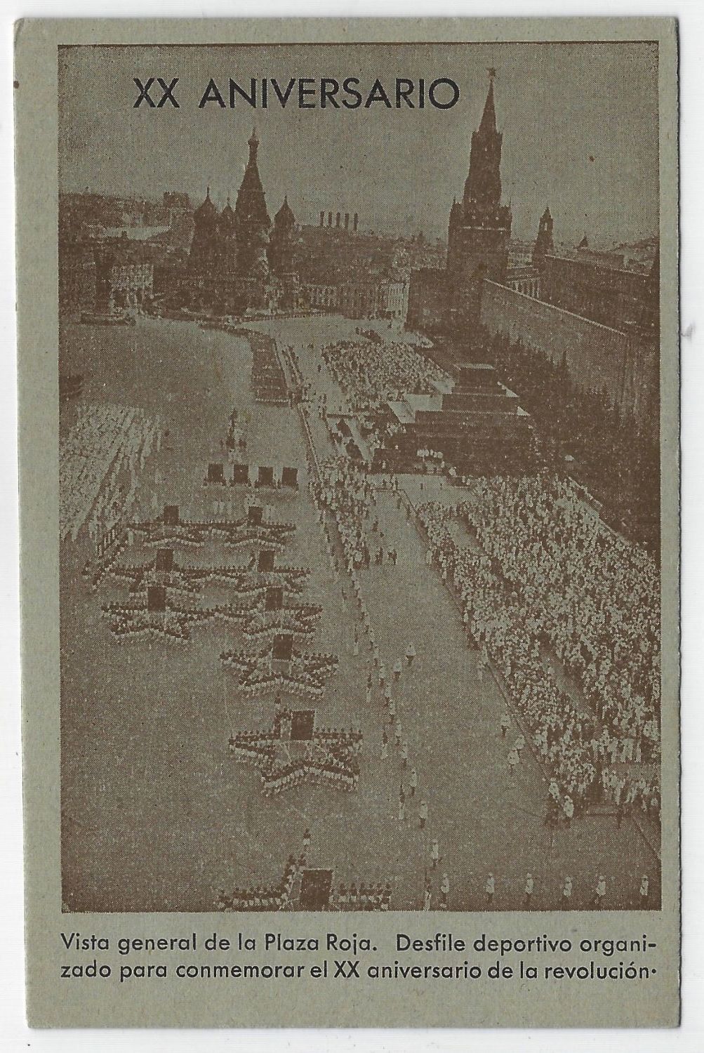 Общий вид на Красную площадь. Спортивный парад, организованный в честь 20-ой годовщины революции. На обороте открытки надпись: "Калинин - председатель Исполнительного комитета СССР". 1937 г. Размер - 14х9 см.